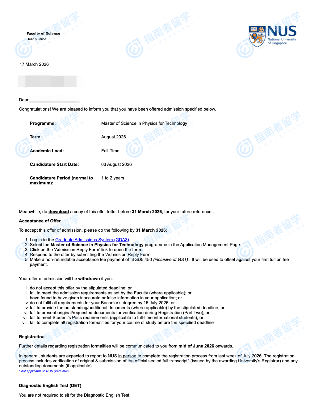 新加坡国立大学技术物理学理学硕士研究生offer一枚