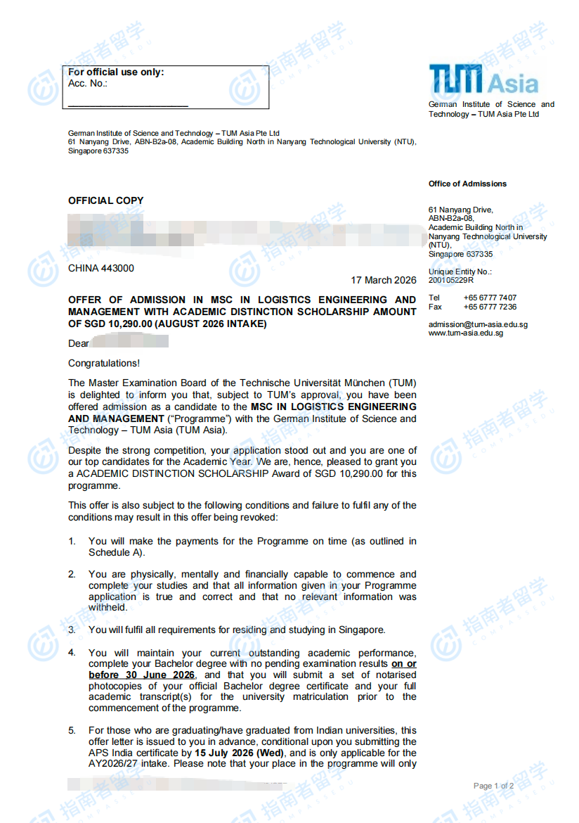 慕尼黑工业大学亚洲分校物流工程与管理理学硕士研究生offer一枚