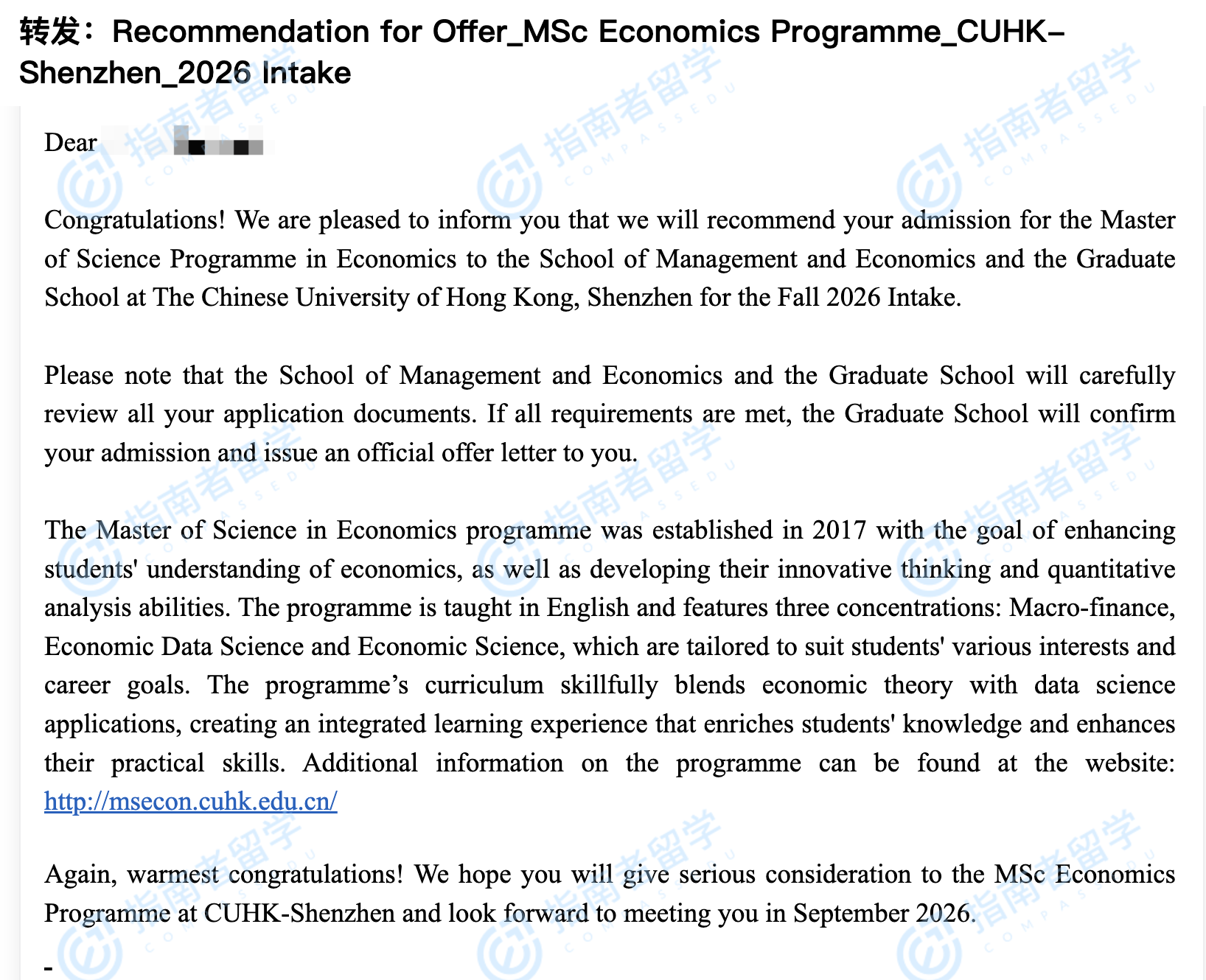 香港中文大学经济学理学硕士(CUHK-Shenzhen)研究生offer一枚