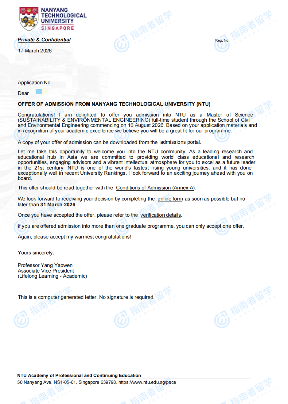 南洋理工大学可持续发展与环境工程理学硕士研究生offer一枚