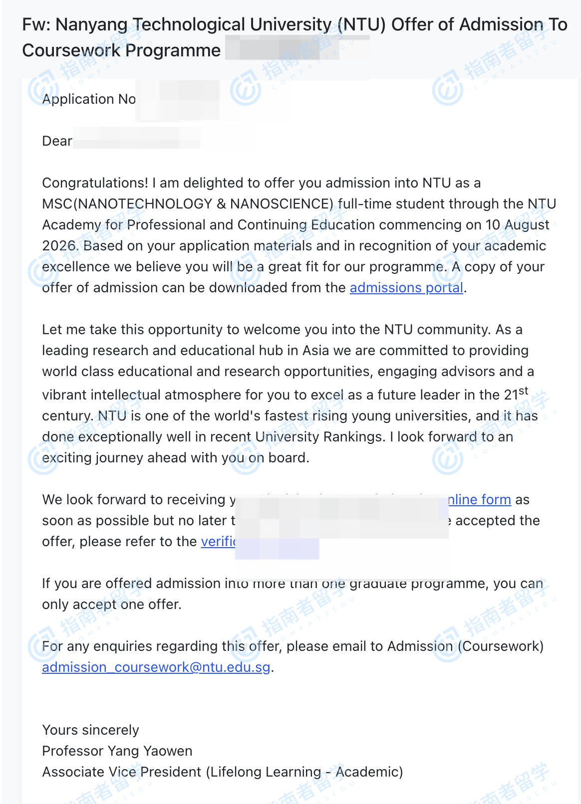 南洋理工大学纳米技术与纳米科学理学硕士研究生offer一枚