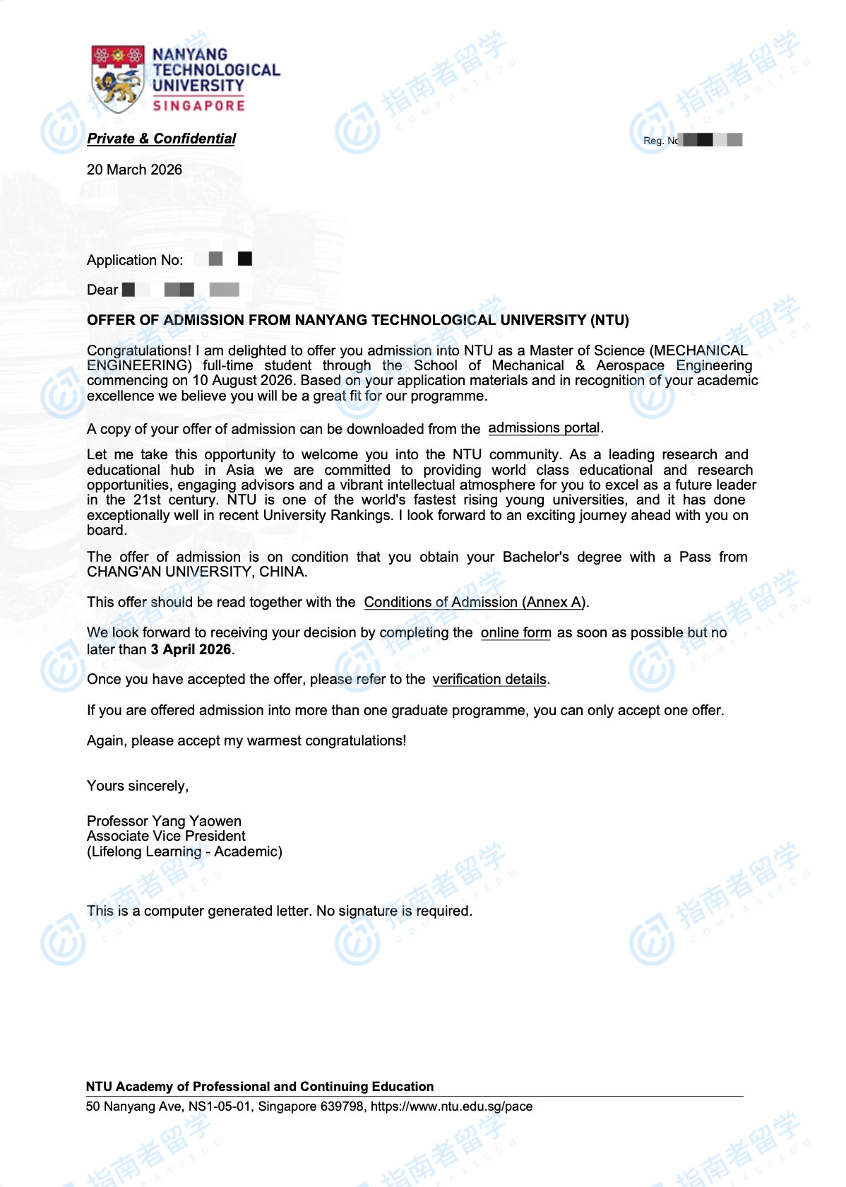 南洋理工大学机械工程理学硕士研究生offer一枚