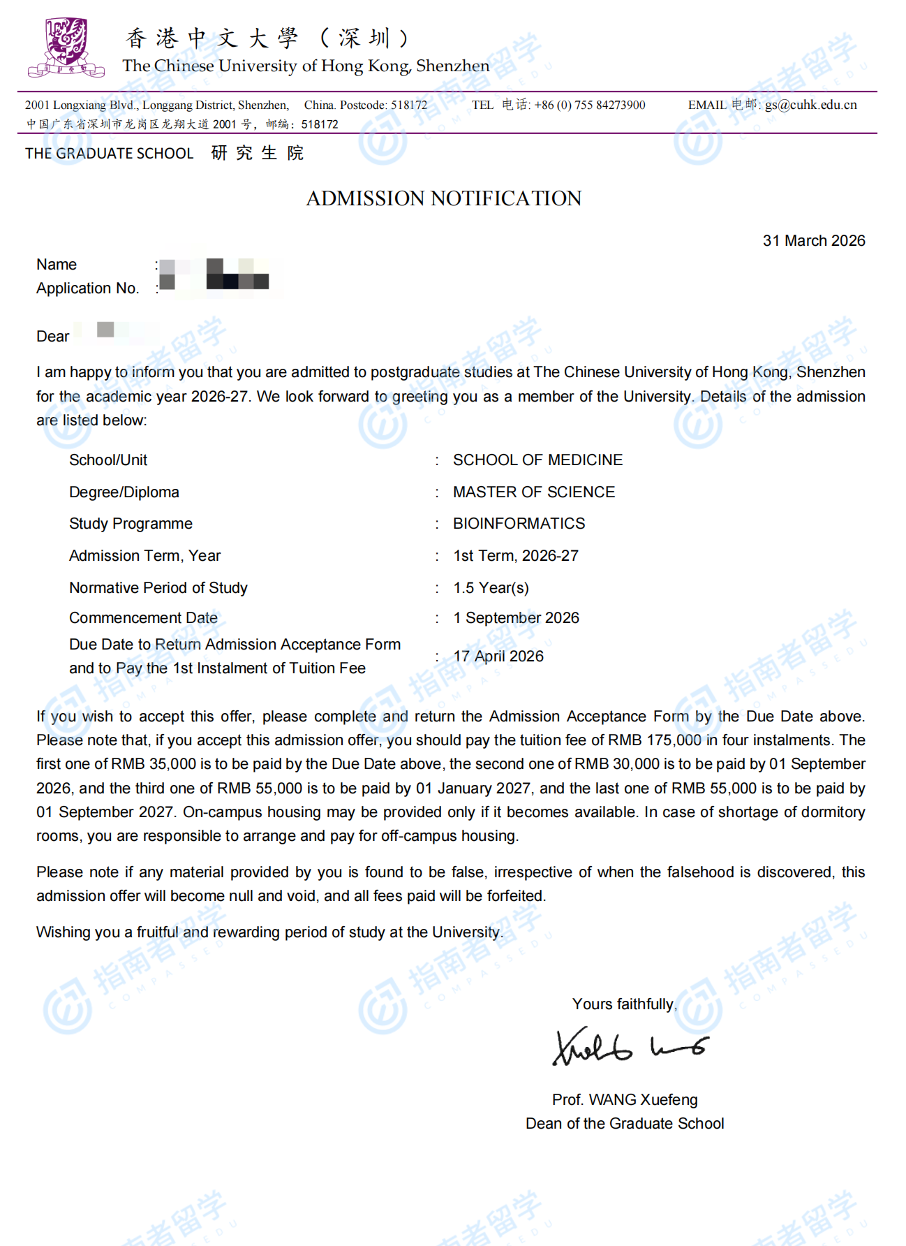 香港中文大学生物信息学理学硕士(CUHK-Shenzhen)研究生offer一枚