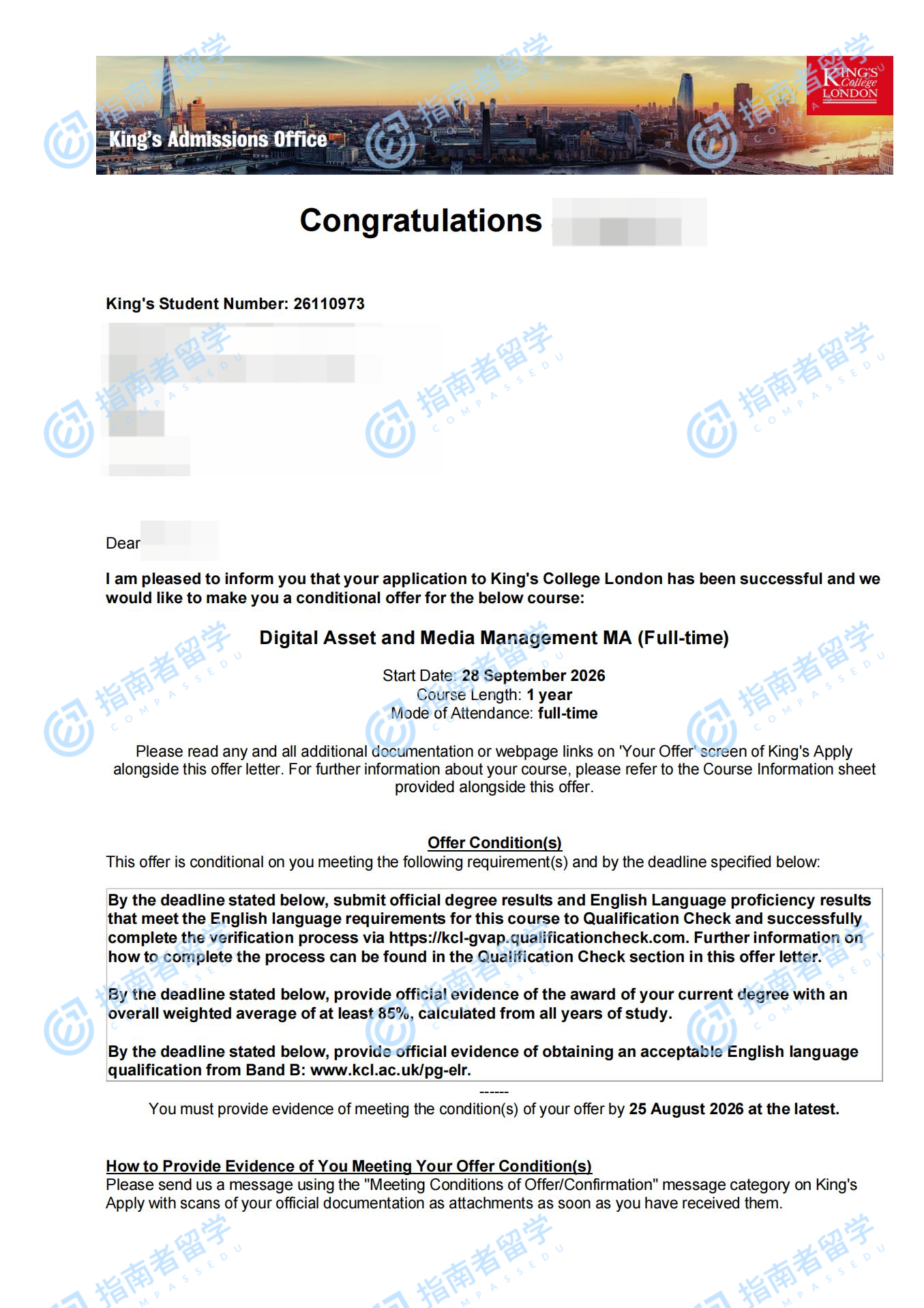 伦敦大学国王学院数字资产与媒体管理文学硕士研究生offer一枚