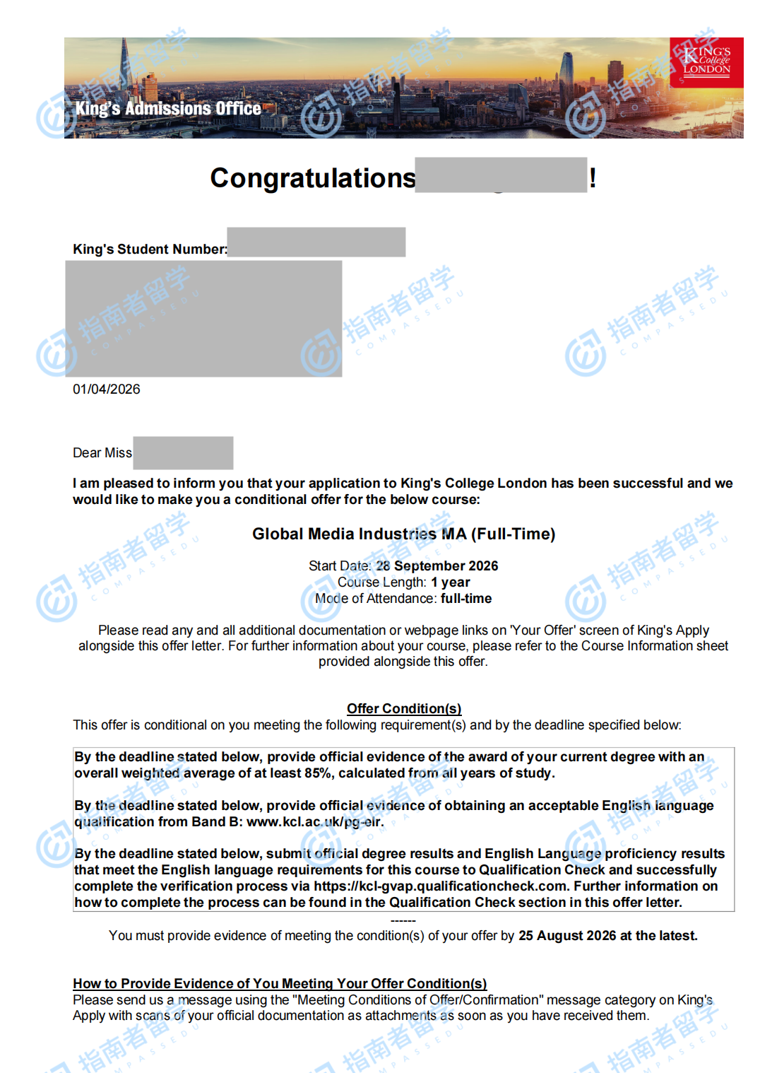 伦敦大学国王学院全球媒体产业硕士研究生offer一枚