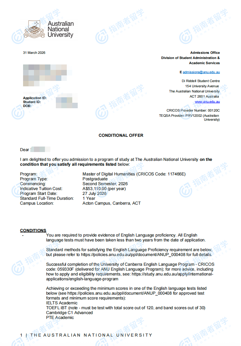澳大利亚国立大学数字人文硕士研究生offer一枚
