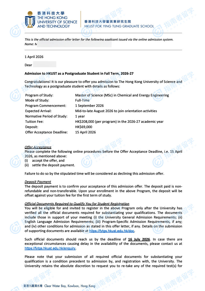 香港科技大学化学与能源工程理学硕士研究生offer一枚