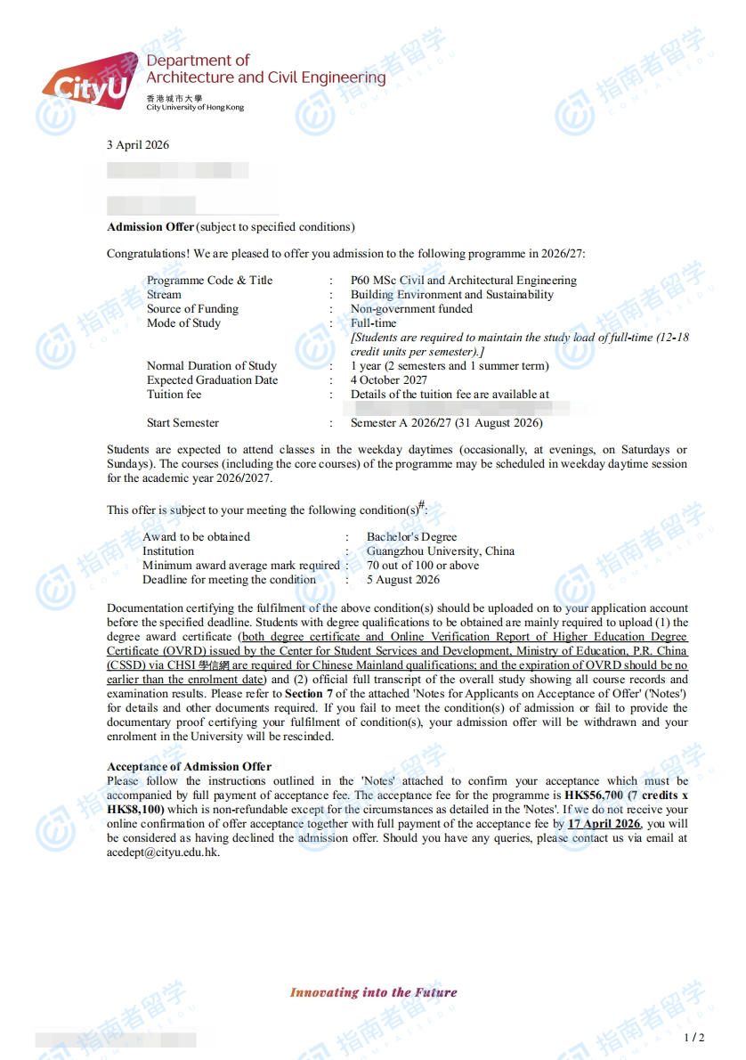 香港城市大学土木与建筑工程理学硕士研究生offer一枚