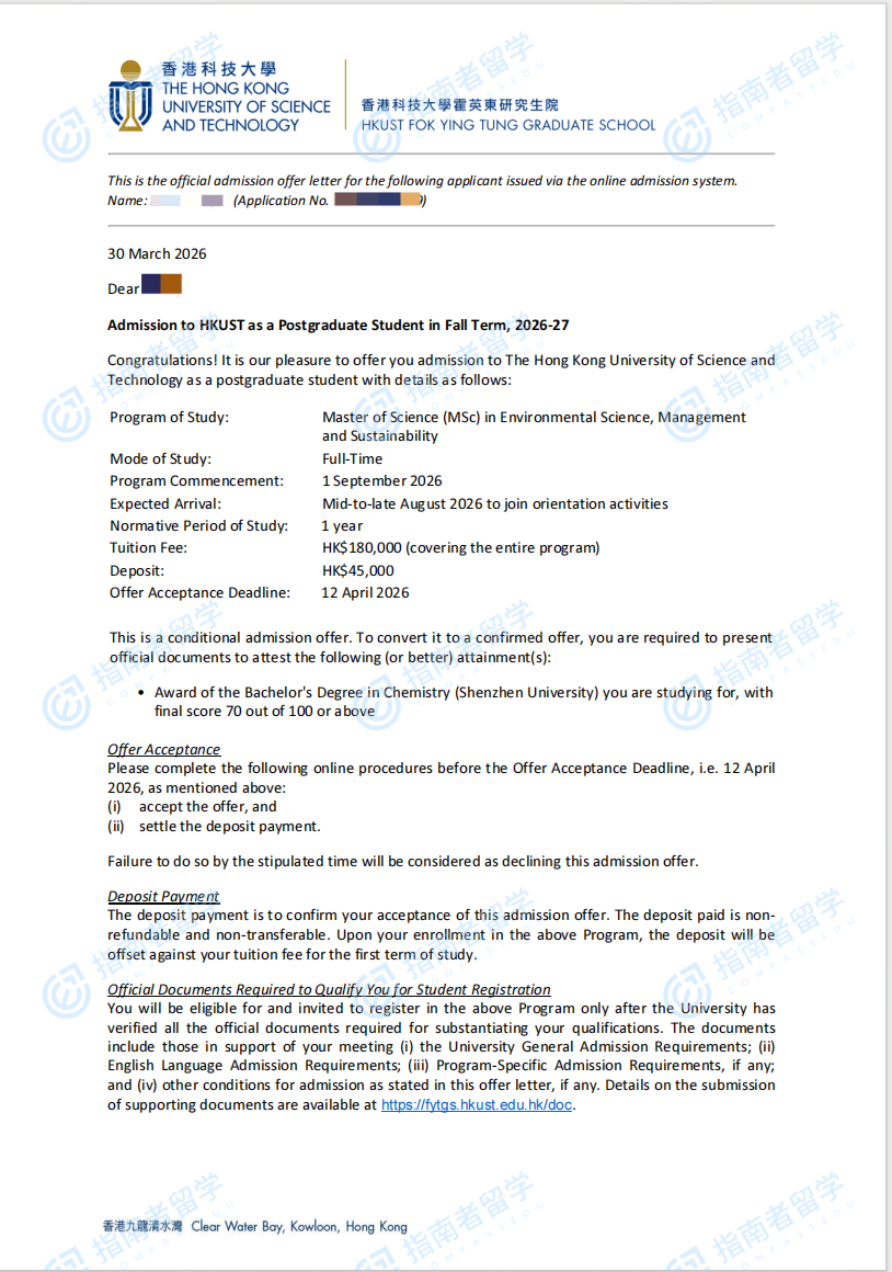 香港科技大学环境科学与管理理学硕士研究生offer一枚