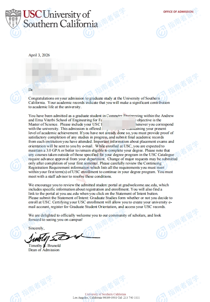 南加州大学计算机工程理学硕士研究生offer一枚