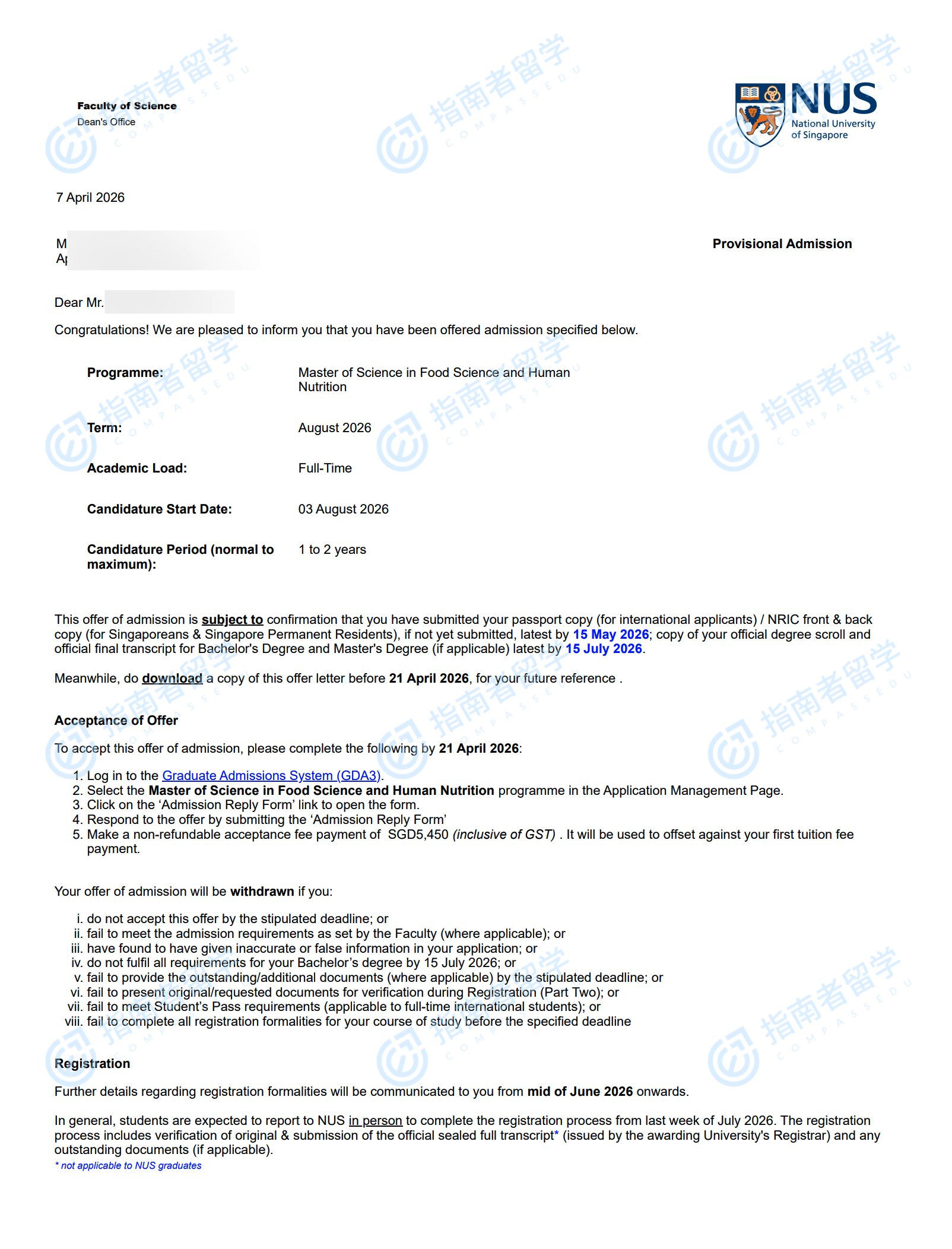 新加坡国立大学食品科学与人类营养学理学硕士研究生offer一枚