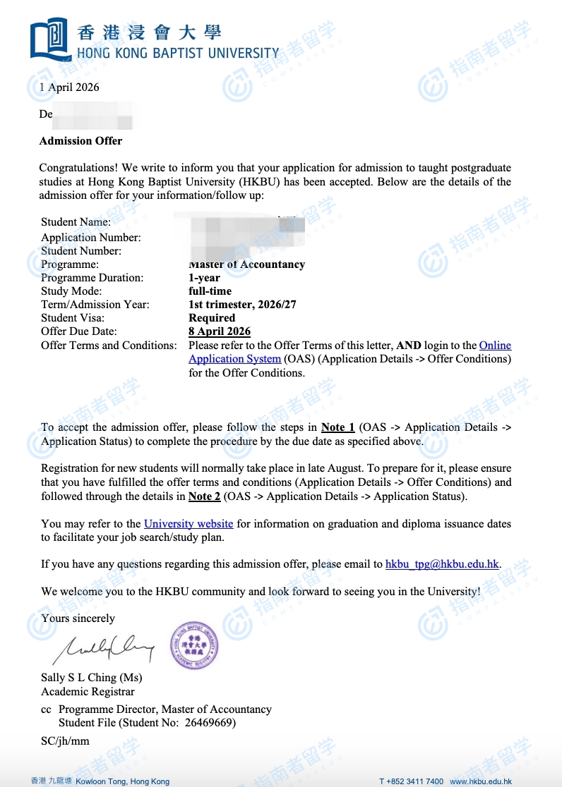香港浸会大学会计学硕士研究生offer一枚