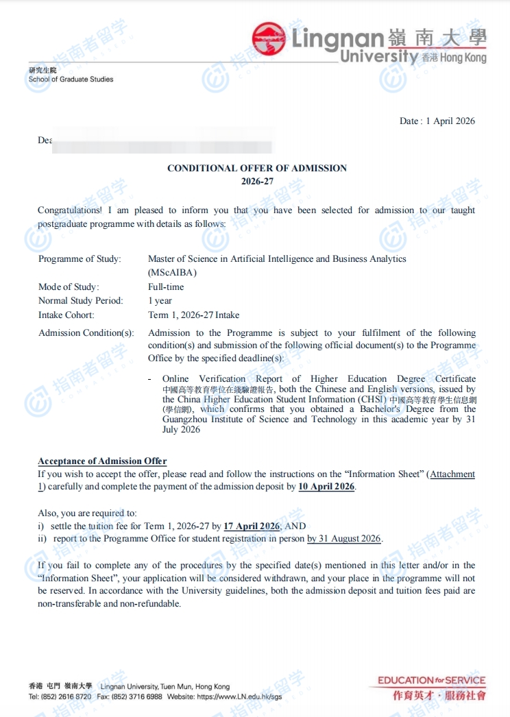 香港岭南大学人工智能与商业分析理学硕士研究生offer一枚