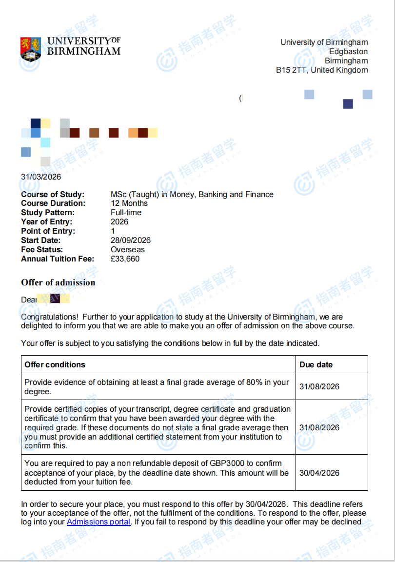 伯明翰大学货币、银行与金融理学硕士研究生offer一枚