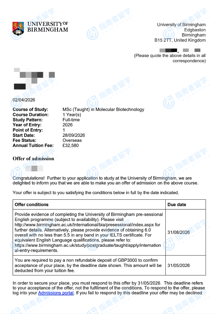 伯明翰大学分子生物技术理学硕士研究生offer一枚