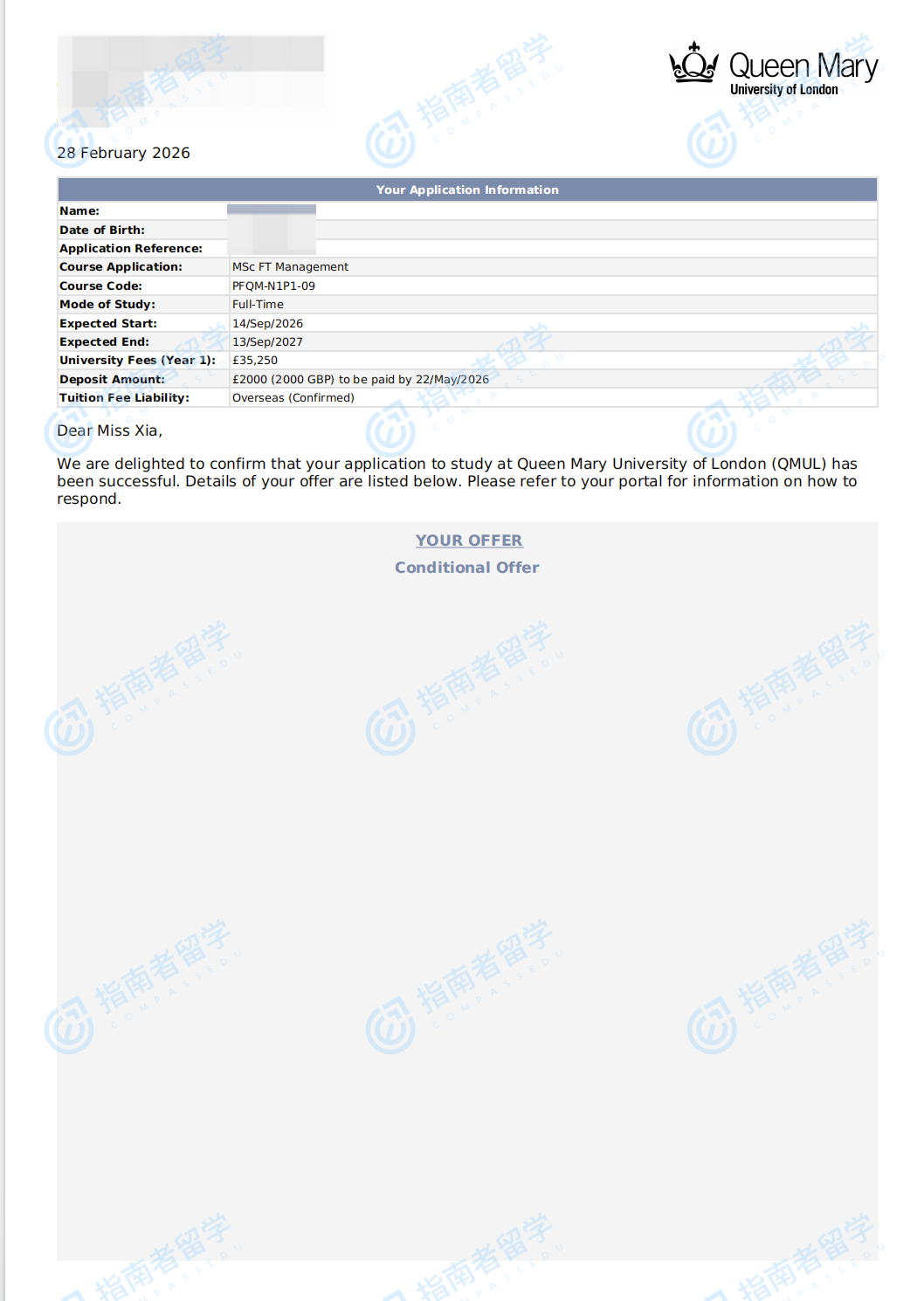 伦敦大学玛丽皇后学院管理学理学硕士研究生offer一枚