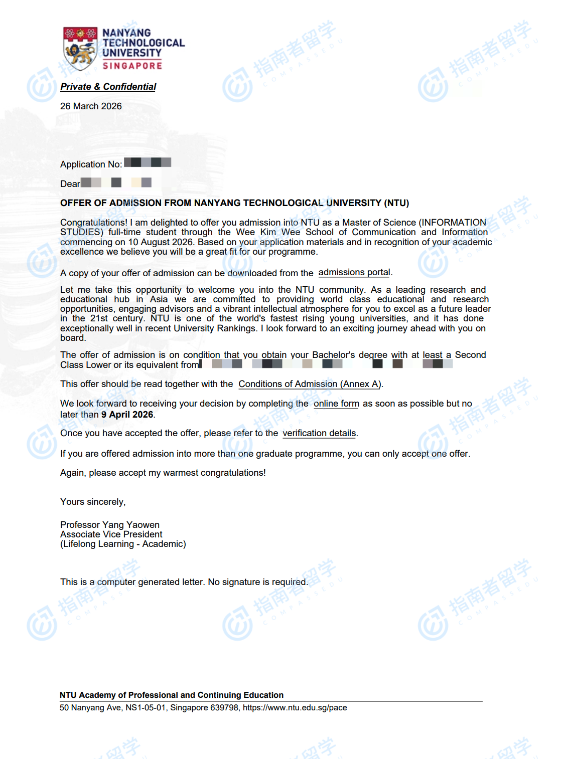 南洋理工大学信息研究理学硕士研究生offer一枚