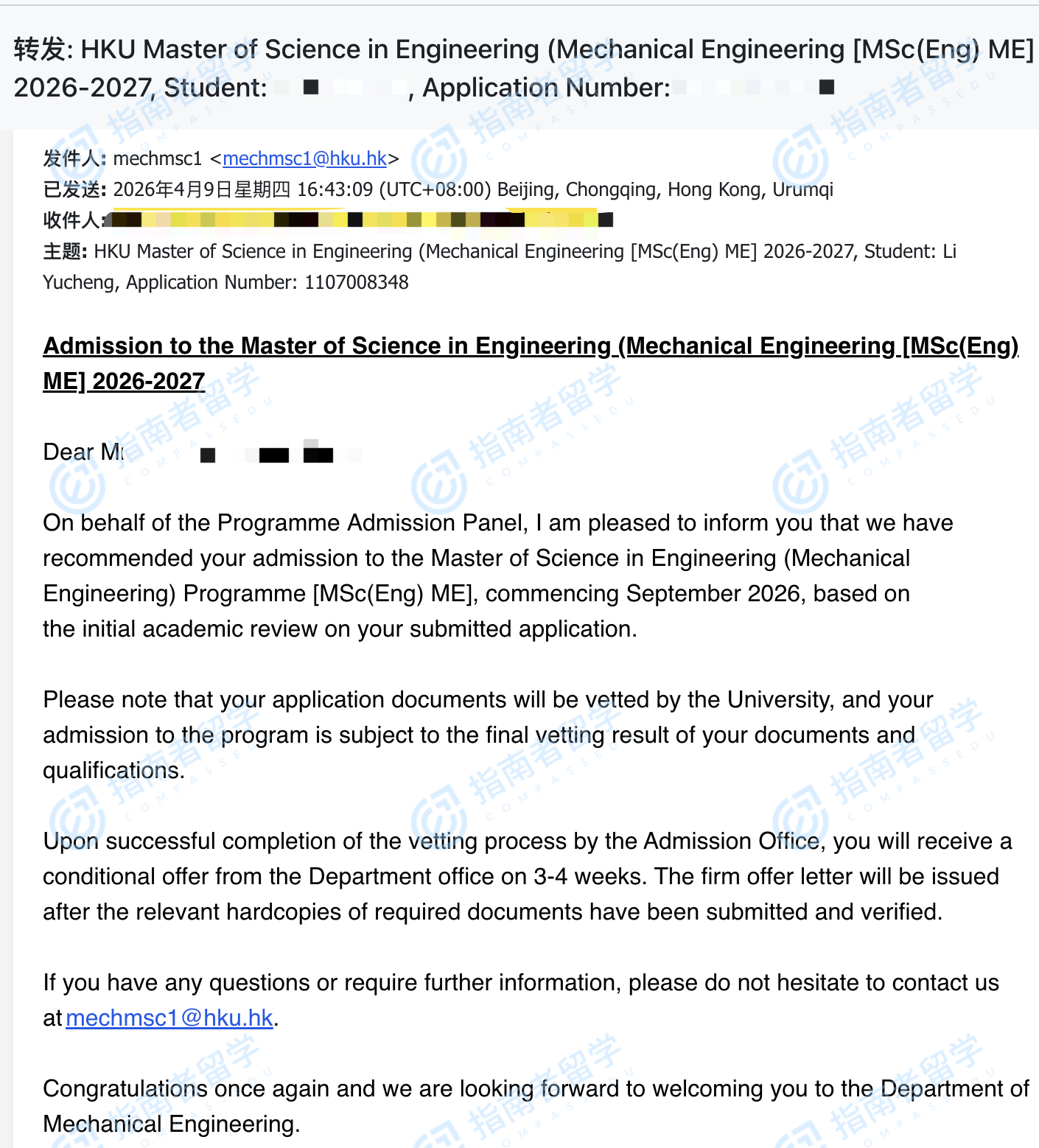 香港大学机械工程(工程)理学硕士研究生offer一枚