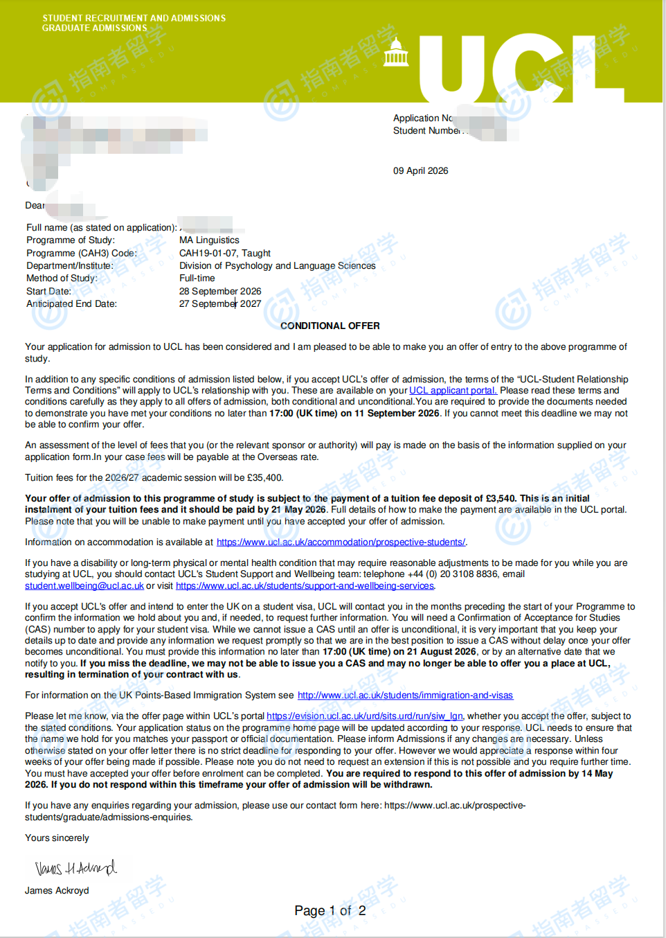伦敦大学学院语言学文学硕士研究生offer一枚