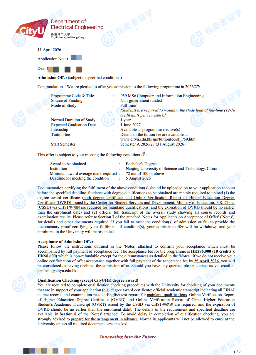 香港城市大学电子计算机与资讯工程理学硕士研究生offer一枚