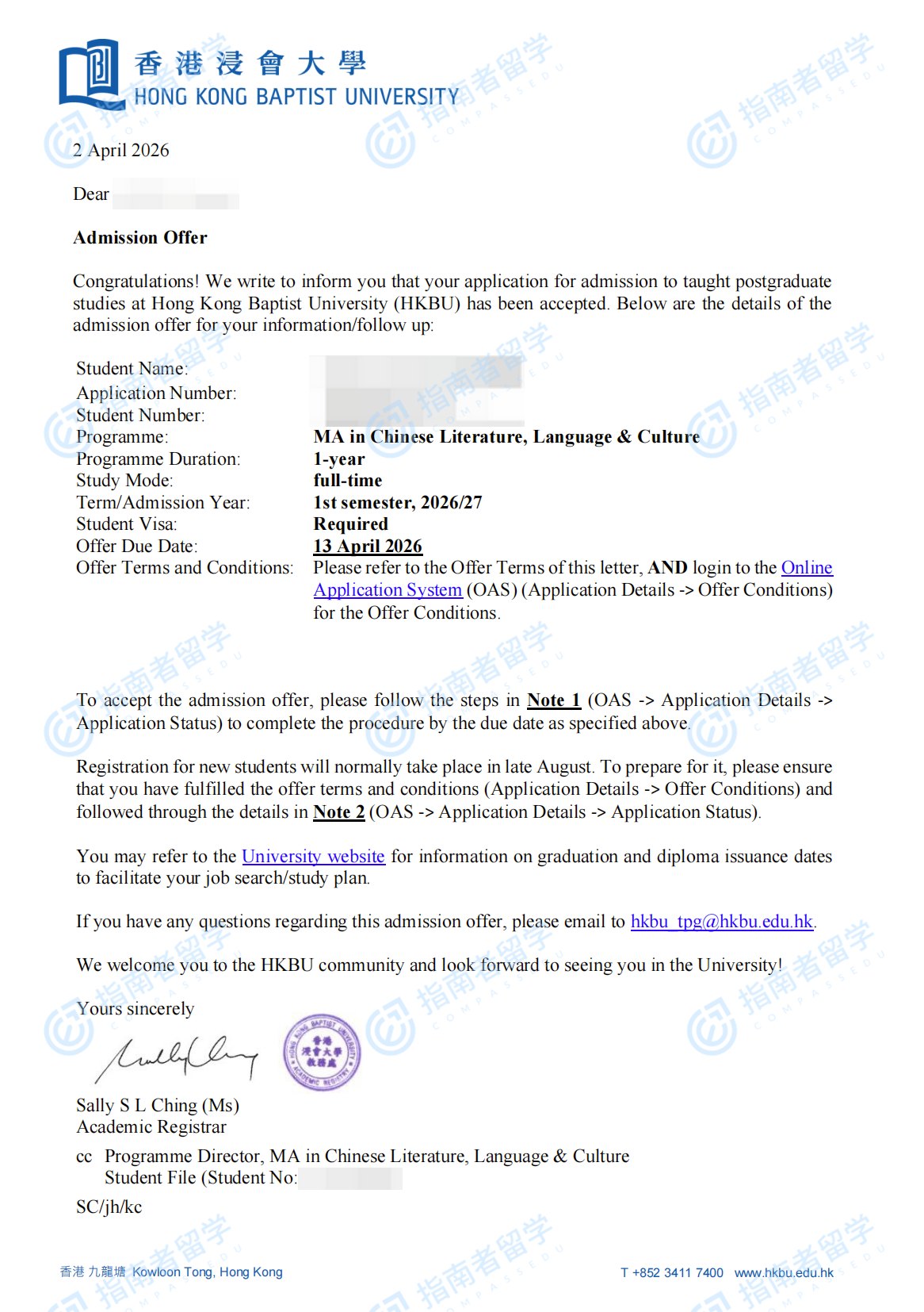 香港浸会大学中国文学、语言与文化文学硕士研究生offer一枚