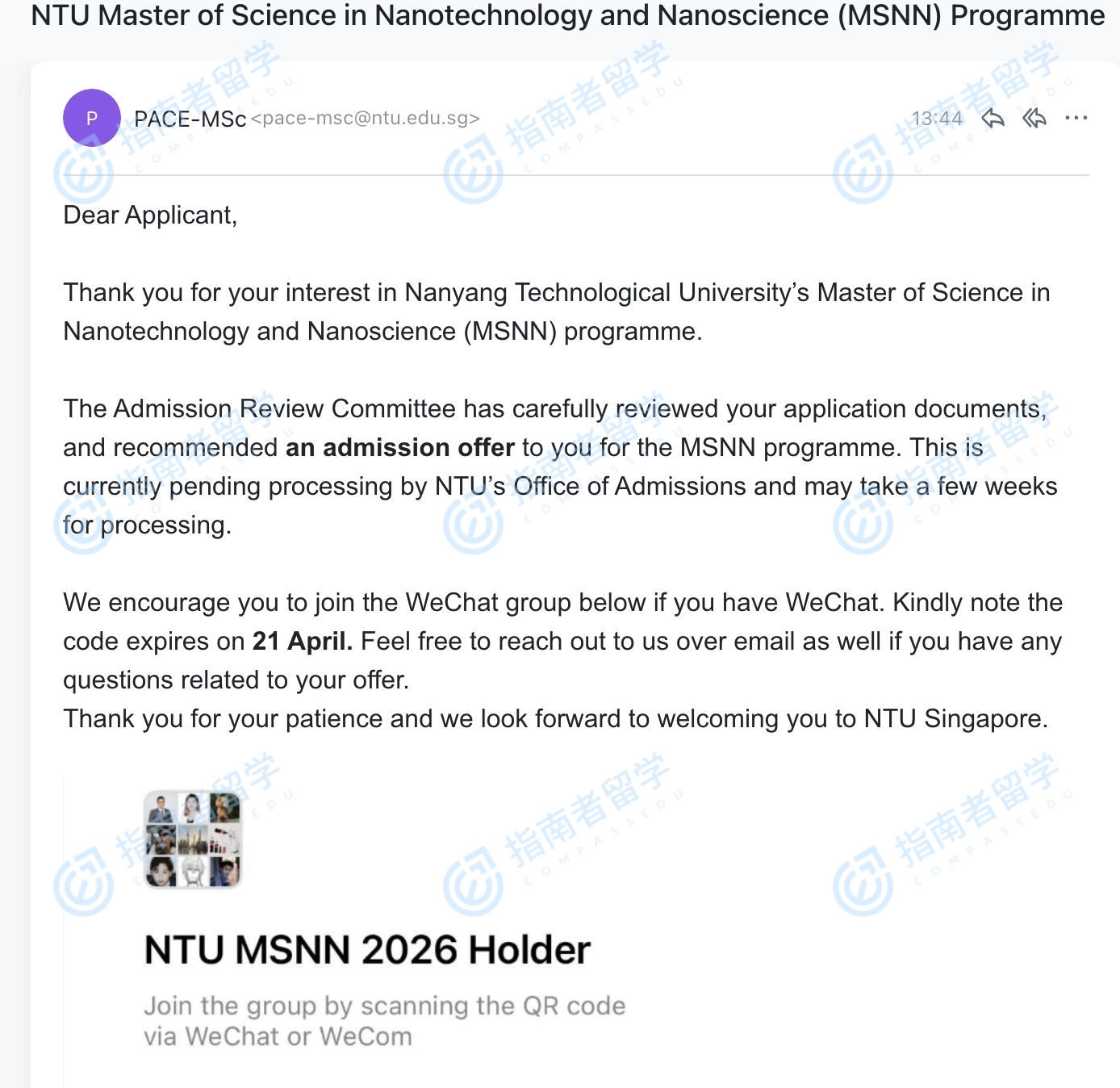 南洋理工大学纳米技术与纳米科学理学硕士研究生offer一枚