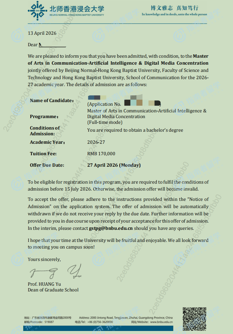 香港浸会大学传播学文学硕士 人工智能与数码媒体专修(北师港浸大)研究生offer一枚