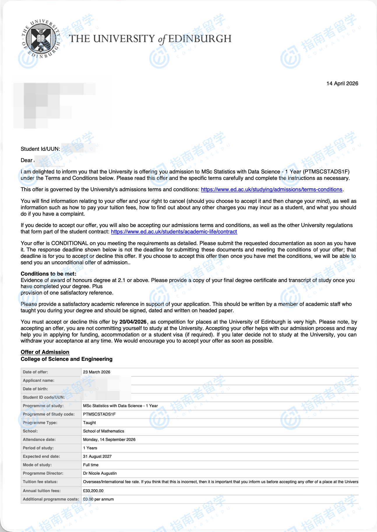 爱丁堡大学统计学与数据科学理学硕士研究生offer一枚