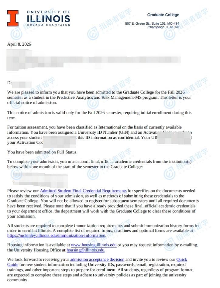 伊利诺伊大学香槟分校预测分析与风险管理硕士研究生offer一枚