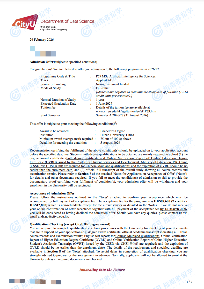 香港城市大学科学人工智能理学硕士研究生offer一枚