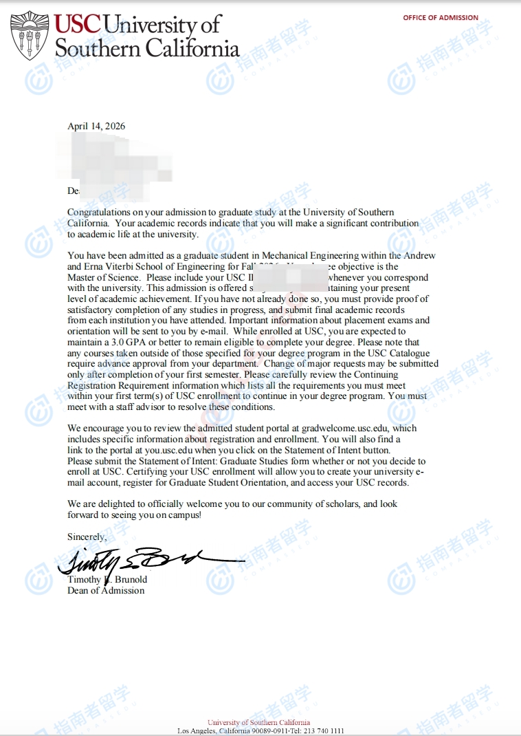 南加州大学机械工程理学硕士研究生offer一枚