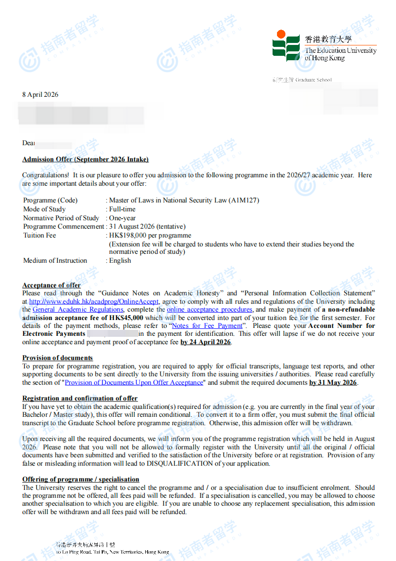 香港教育大学国家安全法法学硕士研究生offer一枚