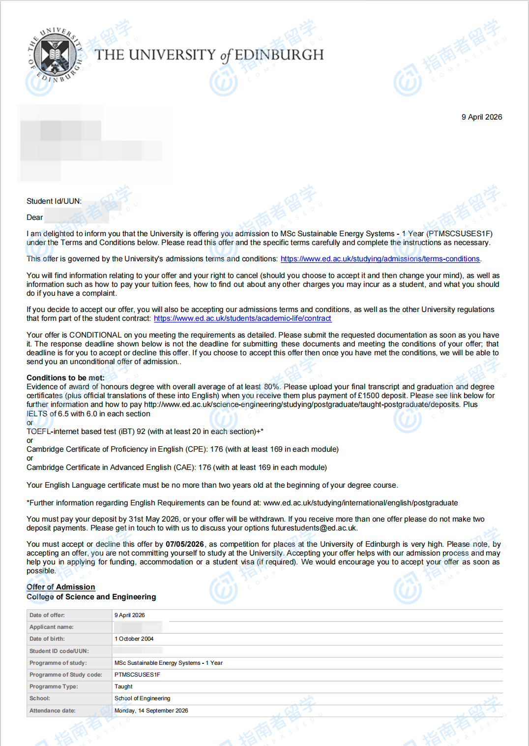 爱丁堡大学可持续能源系统理学硕士研究生offer一枚