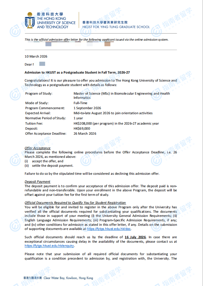 香港科技大学生物分子工程与健康信息学理学硕士研究生offer一枚