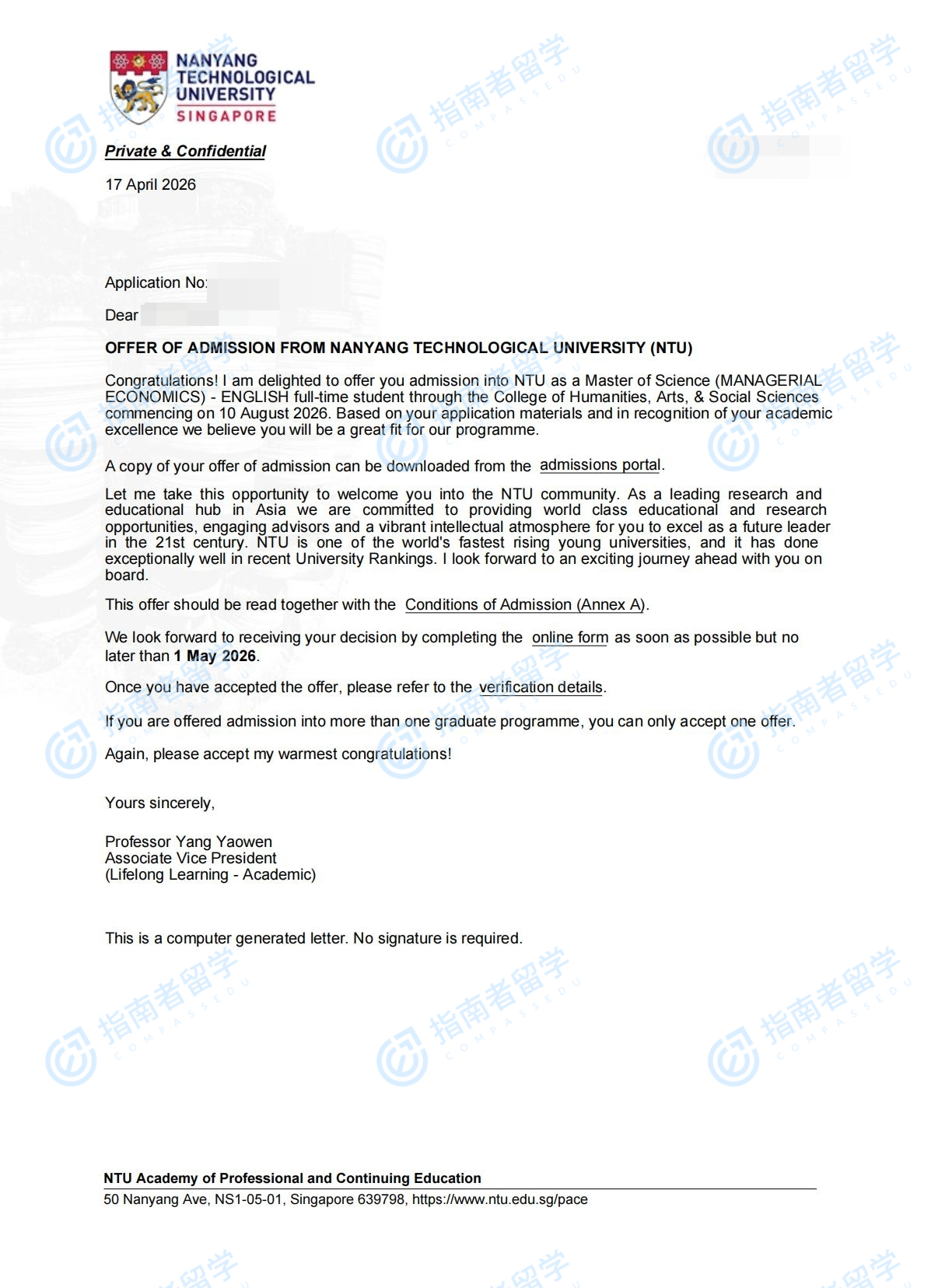 南洋理工大学管理经济学理学硕士(英文授课)研究生offer一枚