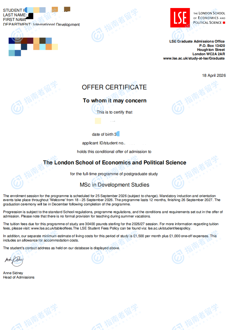 伦敦政治经济学院发展研究理学硕士研究生offer一枚