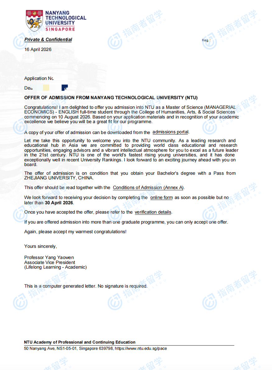 南洋理工大学管理经济学理学硕士(英文授课)研究生offer一枚