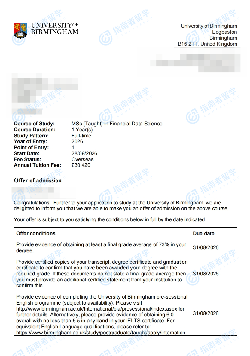 伯明翰大学金融数据科学理学硕士研究生offer一枚