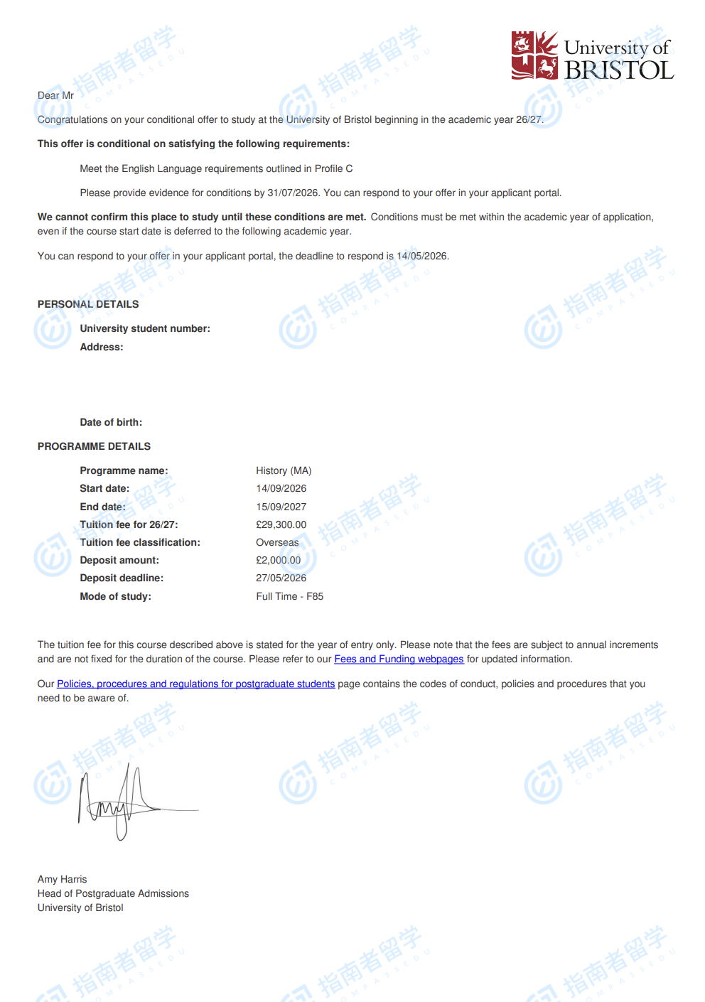 布里斯托大学历史学文学硕士研究生offer一枚