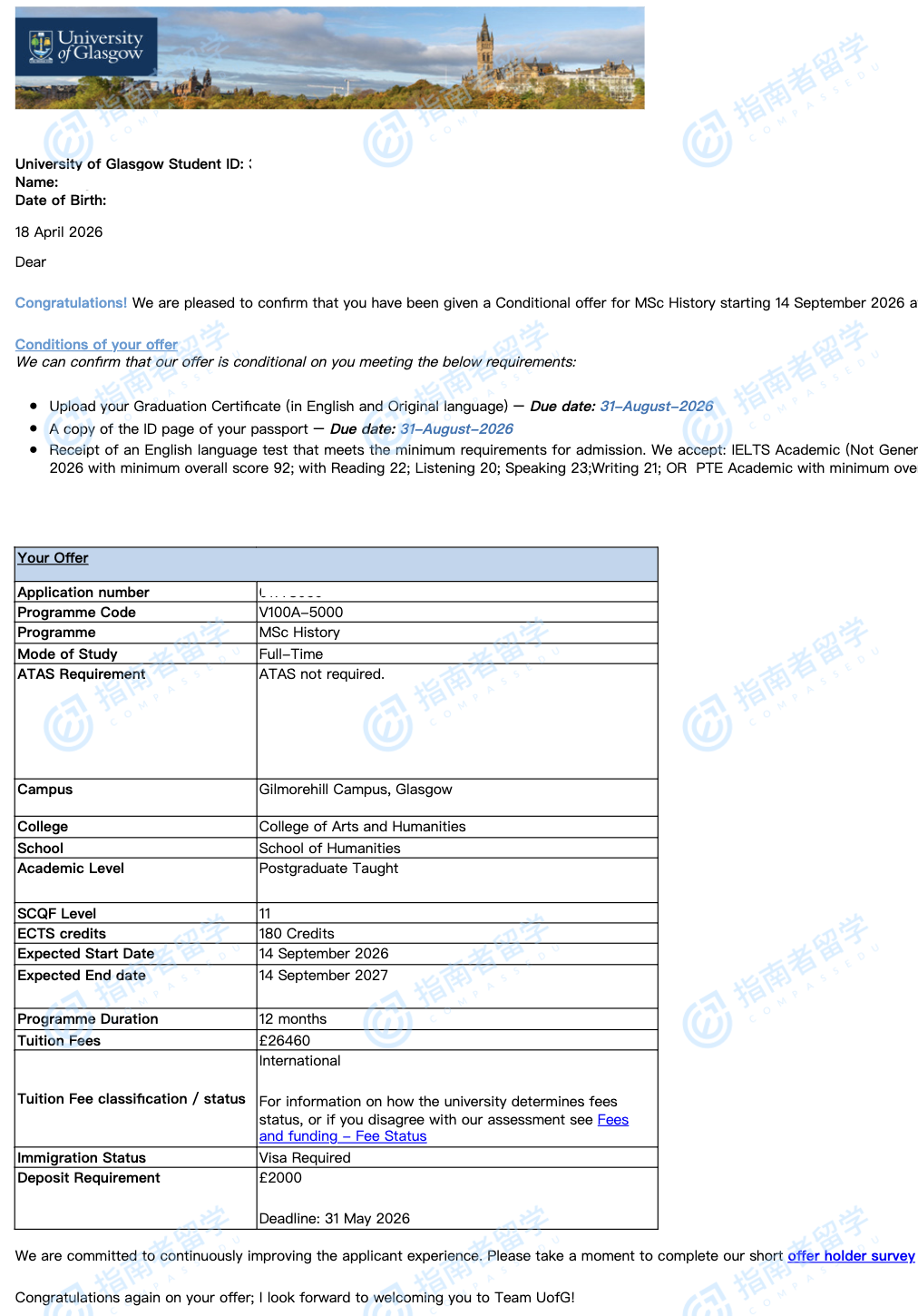 格拉斯哥大学历史学理学硕士研究生offer一枚