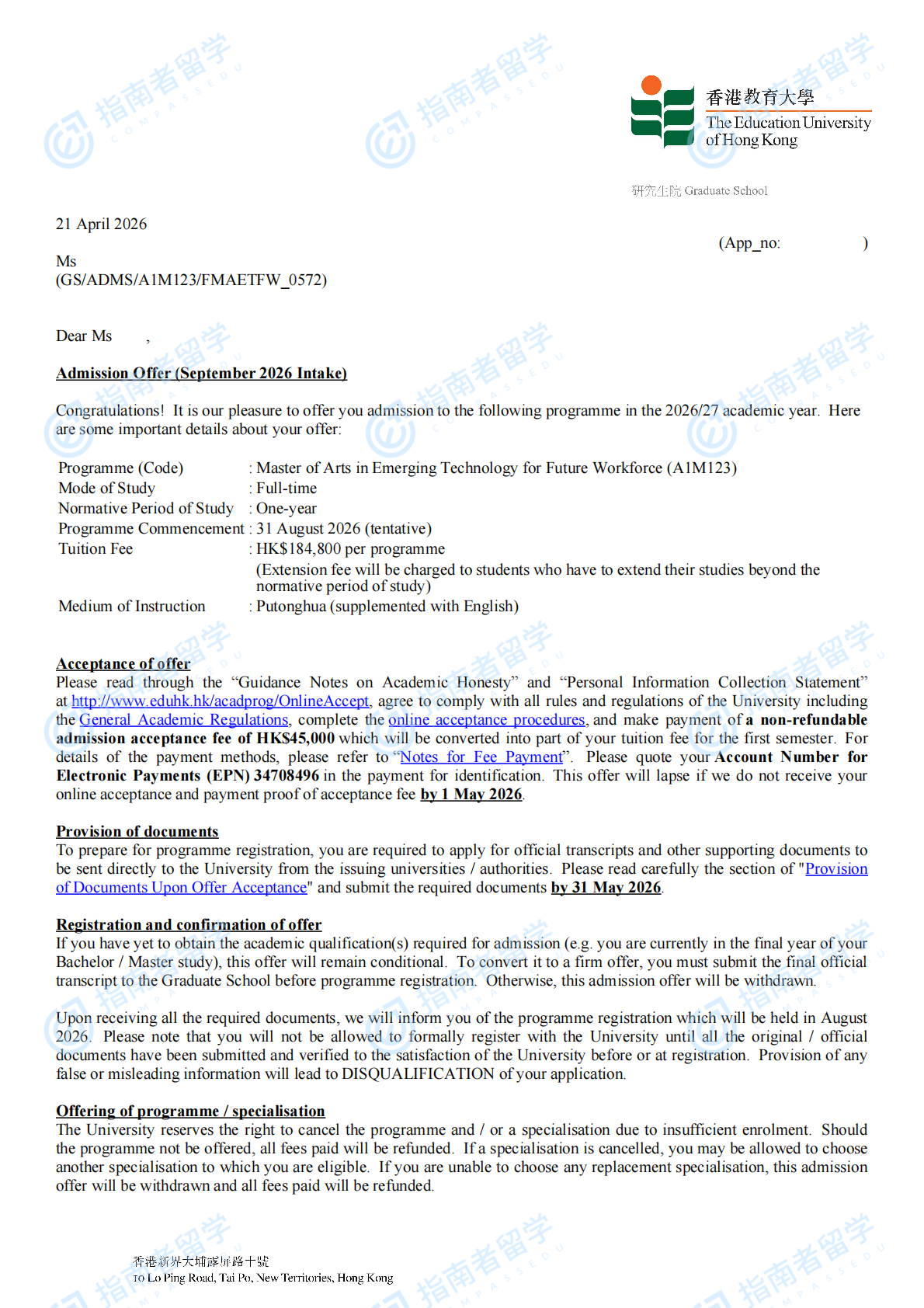 香港教育大学新兴科技赋能的未来人力文学硕士研究生offer一枚