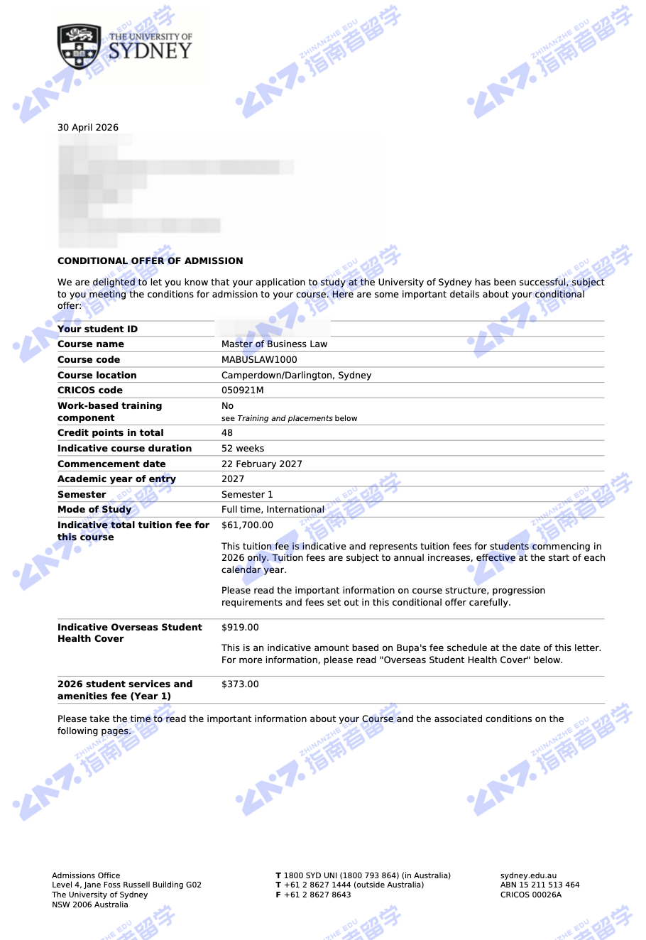 悉尼大学商业法硕士研究生offer一枚