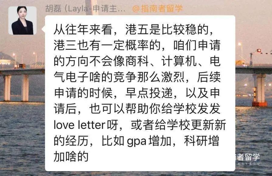 先说外部助力,选对机构真的太重要了。当时找指南者之前,好几家机构看了我的成绩,都觉得港三没戏。