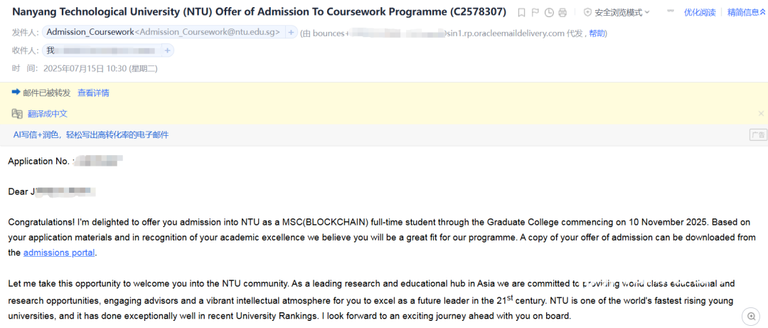 7月15日,Offer发放的最后一天。下午,我已经在考虑gap一年该如何度过了,漫不经心地拿起手机,却有一个熟悉的邮箱发来了邮件。我不可置信地点开了它,发件人赫然是“Nanyang Technological University”时,我的心跳几乎停止!