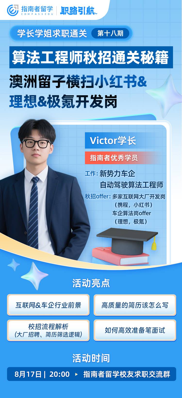 「算法工程师秋招通关秘籍」求职分享会重磅来袭!特邀斩获小红书、理想、极氪等名企Offer的Victor学长,分享互联网&车企算法岗求职经验!深度解析行业前景、简历优化技巧、大厂校招流程及笔面试备战方法,助你高效突围秋招!正在备战秋招的留学生们不可错过,获取算法工程师求职第一手干货!