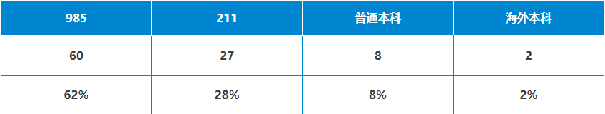 其中,本科院校背景来自985院校的同学共计60枚;211院校的同学共计27枚;普通本科共计8枚;海外本科2枚。