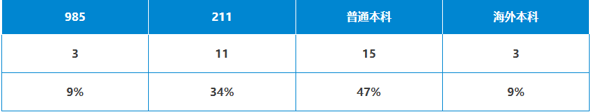 其中,本科院校背景来自985院校的同学共计3枚;211院校的同学共计11枚;普通本科共计15枚;海外本科3枚。