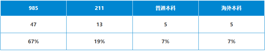 其中,本科院校背景来自985院校的同学共计47枚;211院校的同学共计13枚;普通本科共计5枚;海外本科5枚。