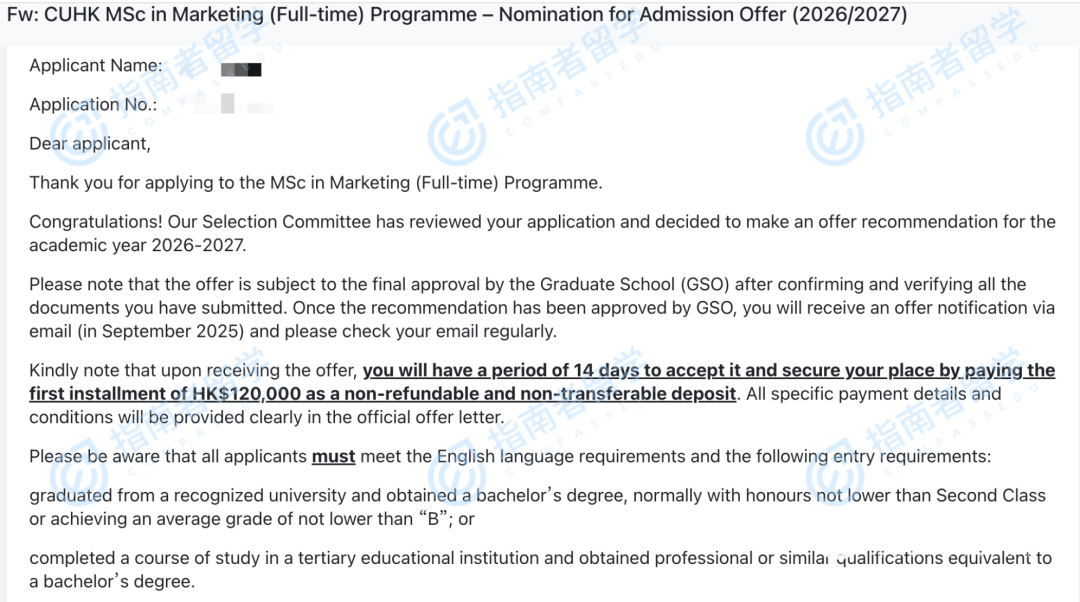 紧接着,九月一日早上,还在实习上班的我,收到了一封邮件,香港中文大学市场营销硕士项目同意了我的申请。我当时反复确认,不敢相信自己的眼睛,直到与申请老师核实后,才确定真的拿到了港中文的 offer。