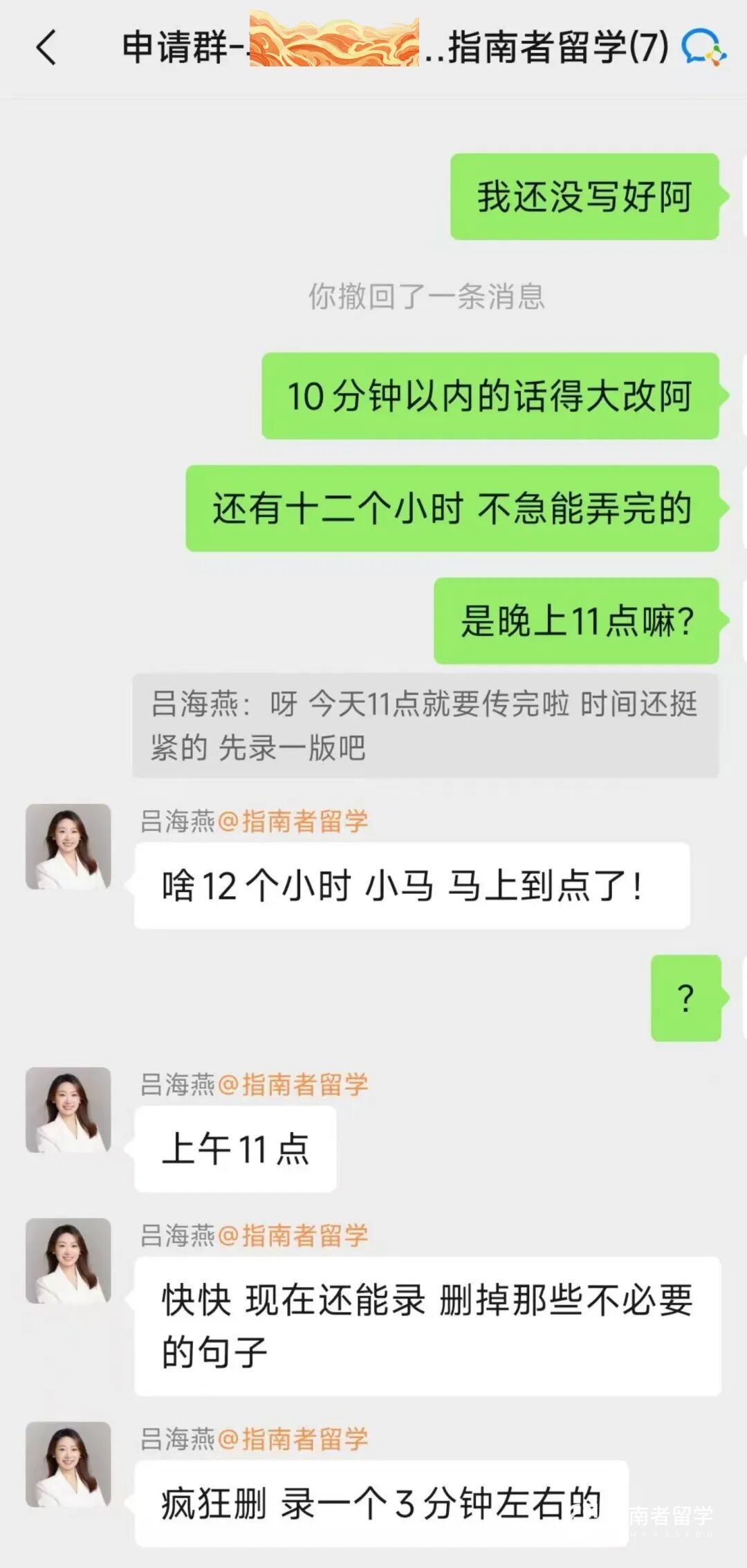 不过,第一次投递就因为粗心大意,险些错过面试。我至今清晰记得当时的情形:我误以为还有十个小时修改视频面试内容,指南者的规划老师却提醒我只剩十分钟。